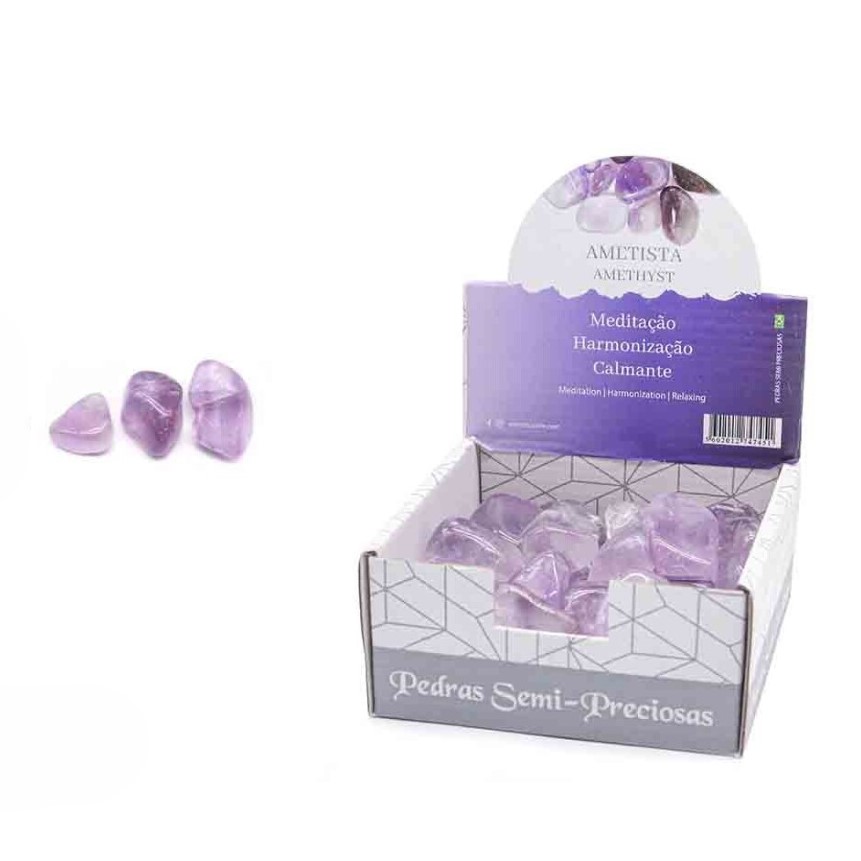 Pedras semi-preciosas de ametista lilás dentro de caixa exibidora