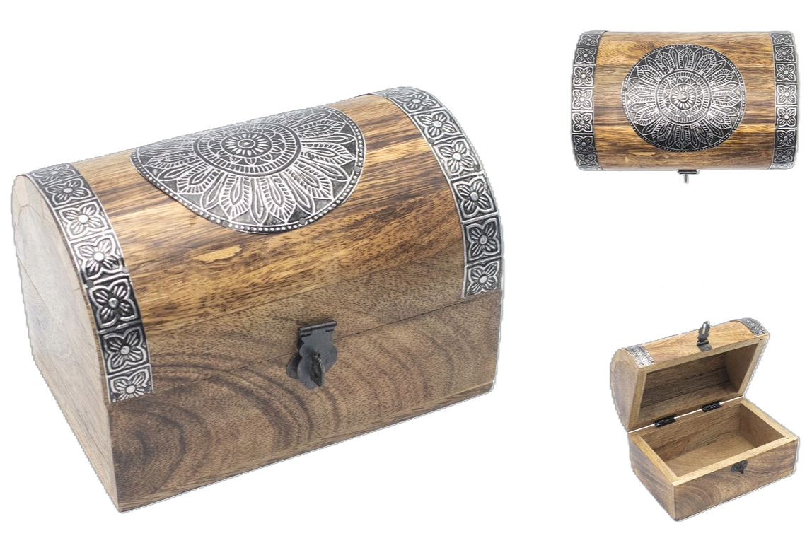 Caixa de madeira decorativa com padrões florais metálicos prateados