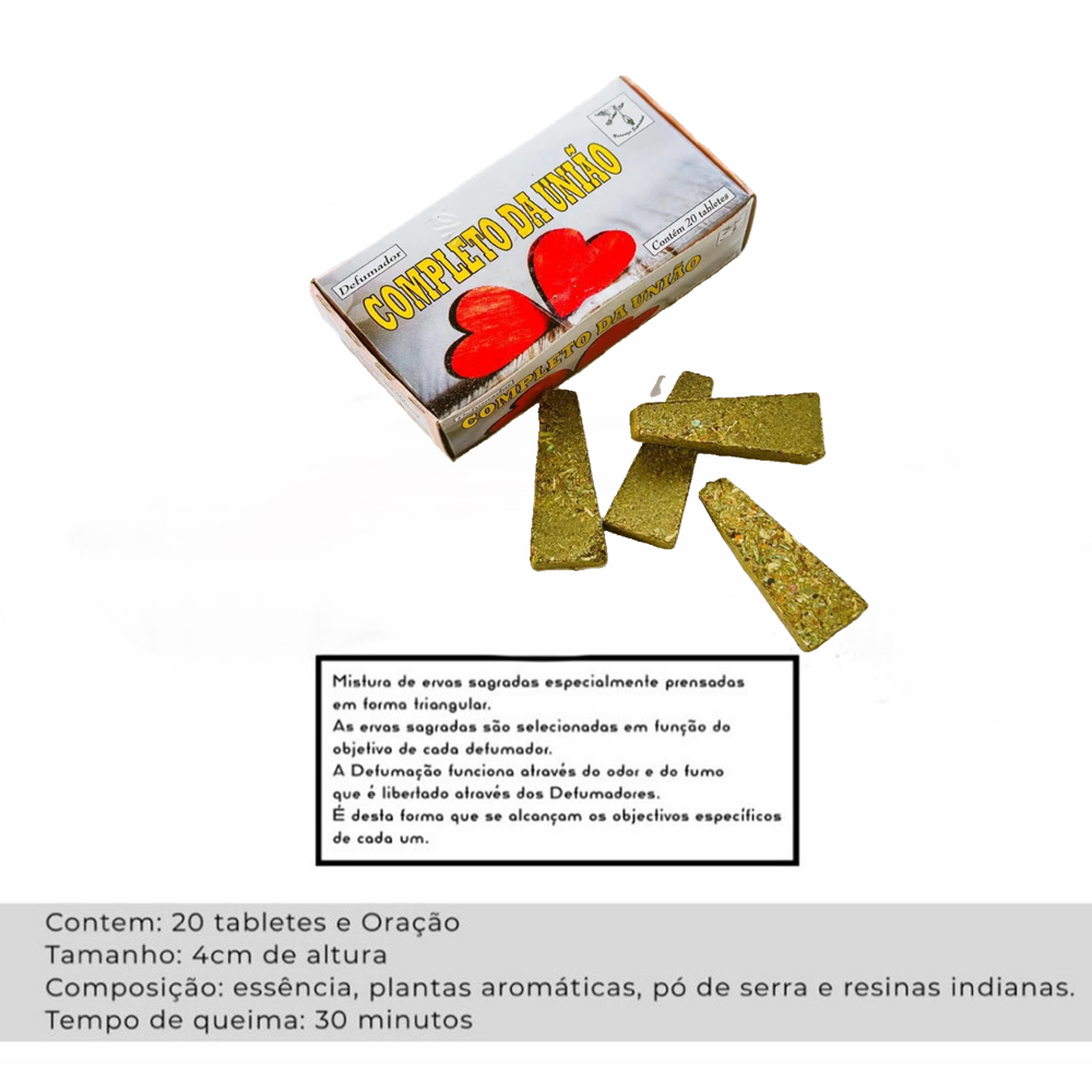 O defumador Completo da União, refere-se a um tipo de defumação que visa purificar e harmonizar as energias de um ambiente, atraindo prosperidade e bem-estar, com foco na união de propósitos, relacionamentos ou ambientes. É frequentemente utilizado para atrair energias positivas e fortalecer laços, seja em relacionamentos amorosos, familiares ou profissionais, e também para criar um ambiente de paz e harmonia.
