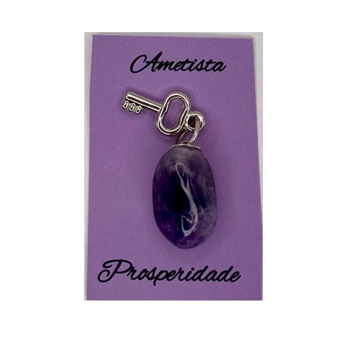 Chaveiro com pedra ametista e chave prateada em cartão lilás com texto