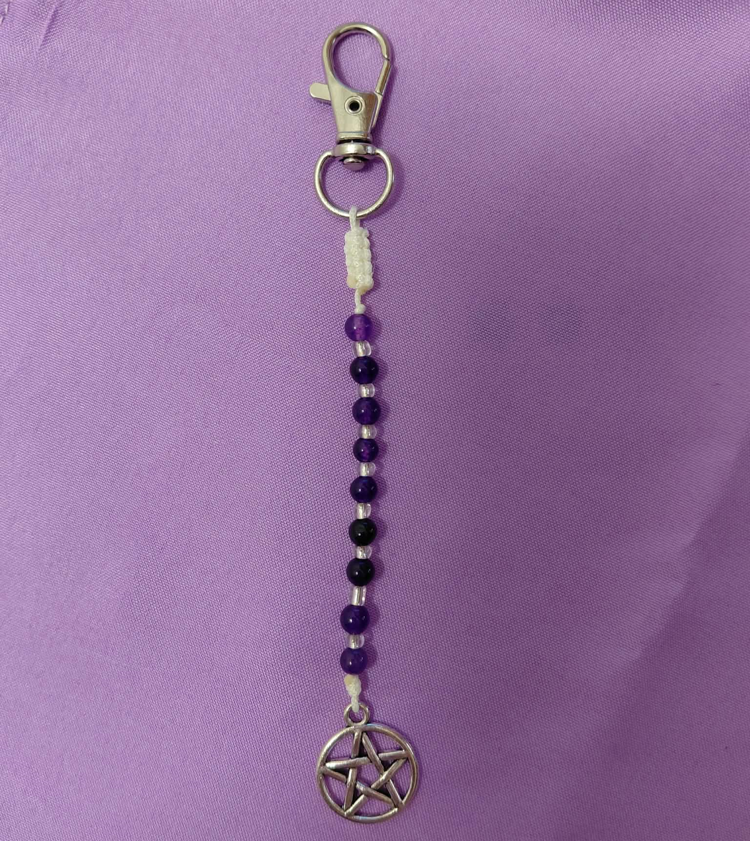 Corrente para chaves com contas roxas e transparente e pendente de pentagrama