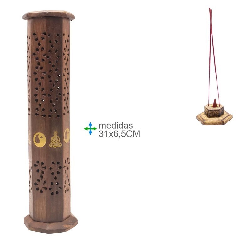 Suporte para incenso em madeira e metal com padrão decorativo e incensos vermelhos
