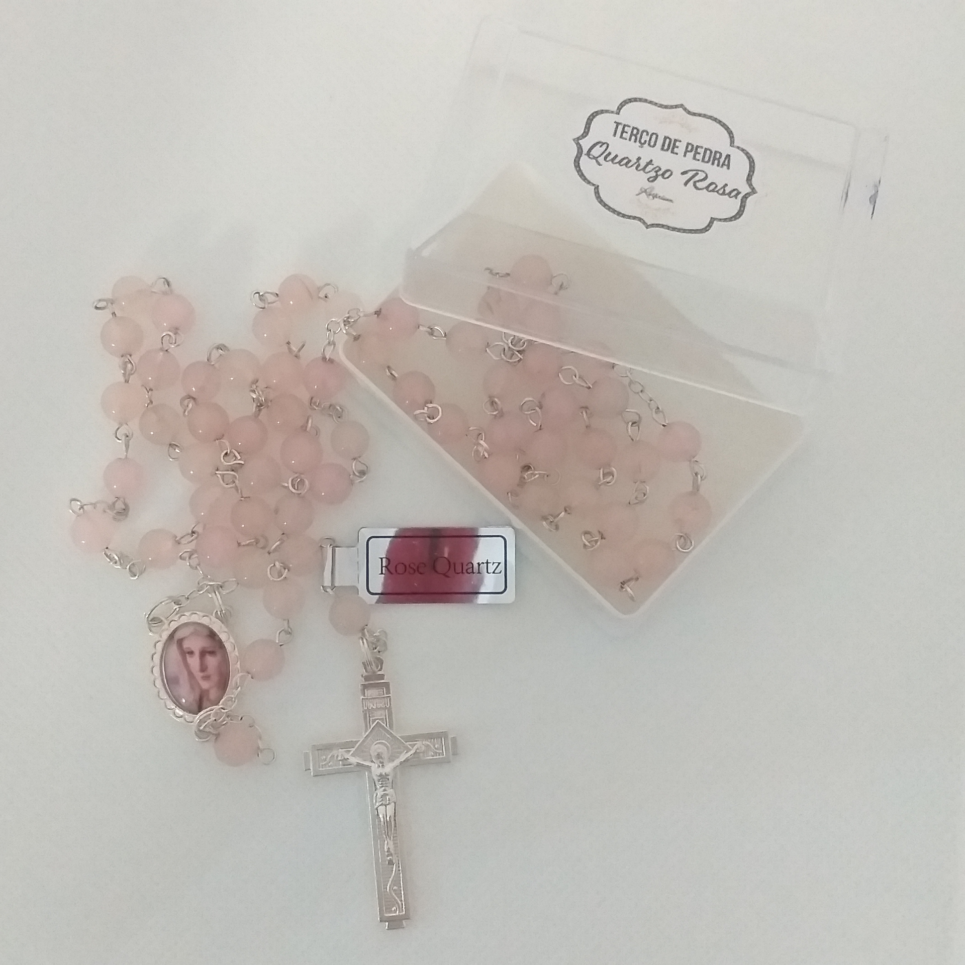 Terço rosa quartzo com caixa plástica e crucifixo prateado